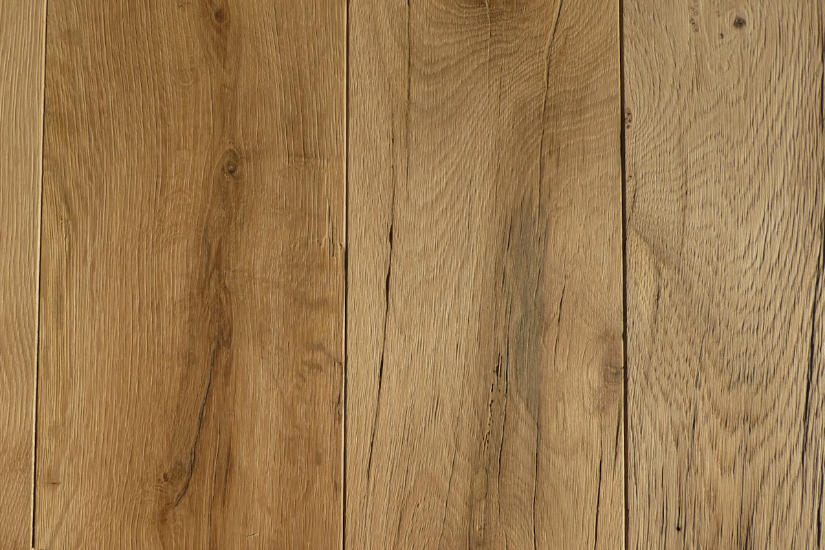 Hierbei handelt es sich um einen sehr robusten Boden erzeugt aus alten Eichenbalken. Die Oberseite der Altholzdielen ist geschliffen und gebürstet. Farbe und Strultur sind hier ruhiger als bei den anderen Eichenböden aus Altholz, haben jedoch im Unterschied zu neuem Holz immer noch typischen Altholzcharakter. Das heißt Farbwechsel, Wurmlöcher, Risse, Verfärbungen u.ä. müssen erwünscht sein! Auch hier handelt es sich um ein technisch neues Produkt, erzeugt aus 100+ Jahre altem Eichenholz.