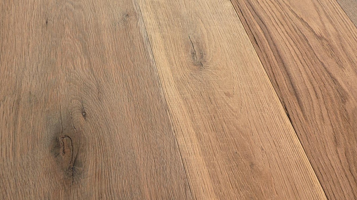 Die Deckschicht dieses Altholzbodens wird aus antiker Eiche erzeugt und ist sägerau und gebürstet.