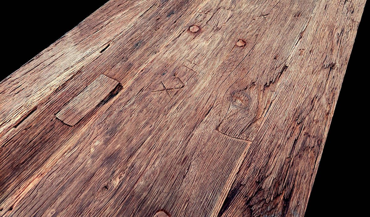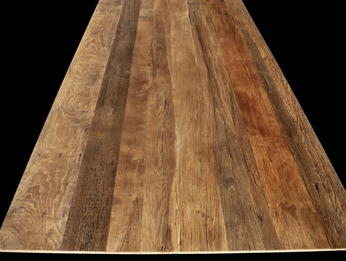 Diese Dreischichtplatte aus antiker Eiche besteht aus original belassener Eichenoberfläche.