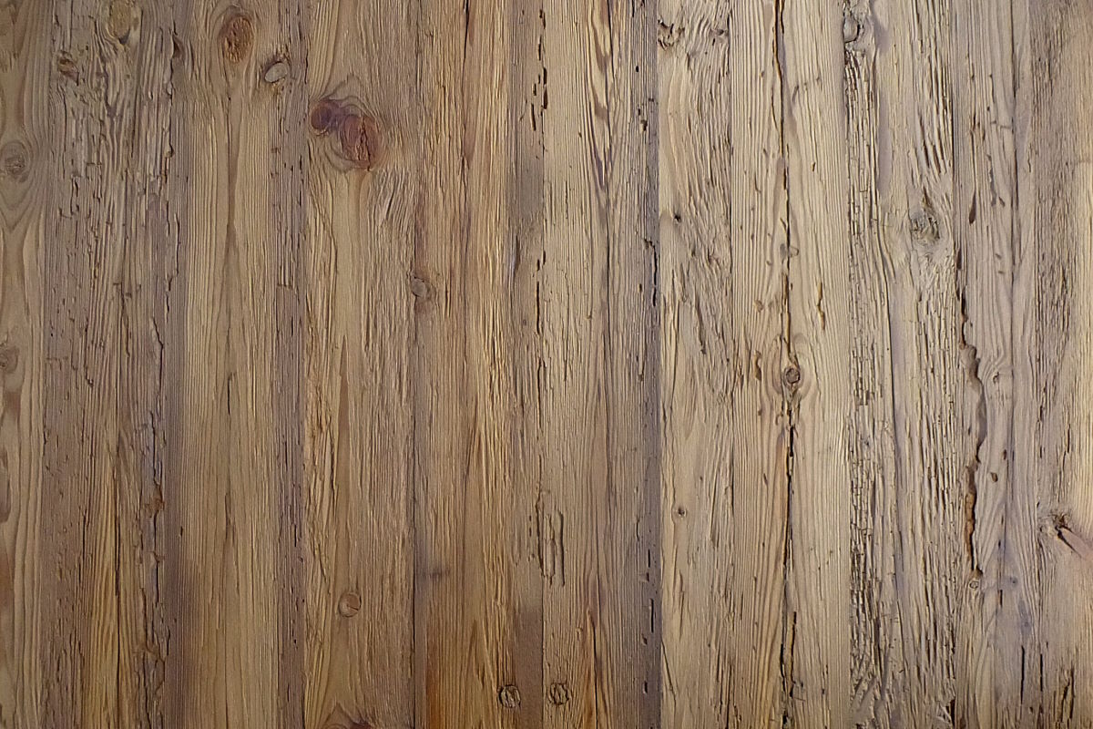 Auch diese Dreischichtplatte wird aus antiken Balken erzeugt. Jedoch handelt es sich bei der Decklamelle um das Holz aus dem Inneren des Balkens, welches nachträglich gedämpft und gehackt wird. Dadurch entsteht ein etwas "ruhigeres" und gleichmäßigeres Bild in Oberfläche und Farbe als bei der Platte mit original gehackter Oberfläche. Die Oberfläche wird abschließend noch gebürstet.