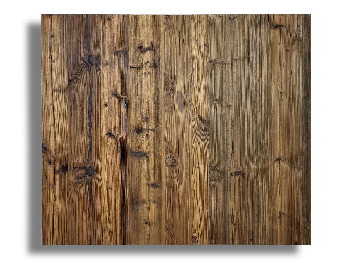 Die Decklamellen der Platte werden aus "sonnenverbrannten" Brettern erzeugt und gebürstet.